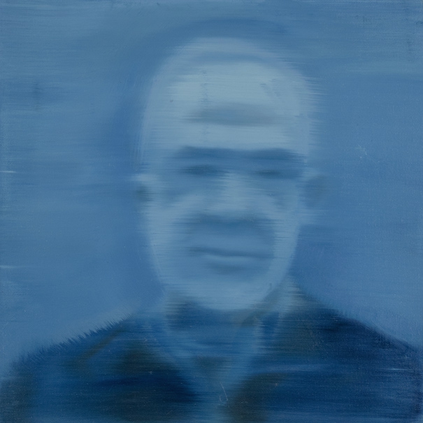 oil on canvas; conceptual portrait; blurred male face; frontal bust; monochrome blue palette; photographic painting reference; inspired by Richter; archival painting; fictional archive; painterly abstraction; portrait reinterpretation; post-photographic image