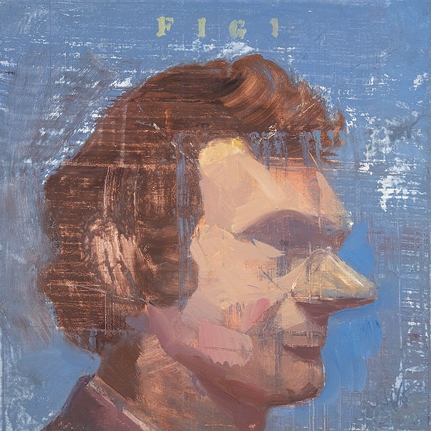 Conceptually, the painting draws inspiration from a 1969 photograph by Maria Gilissen, Marcel Broodthaers’s wife, depicting the artist wearing a fake nose in front of a Belgian art transport truck during the filming of Un Voyage à Waterloo (Napoléon 1769–1969). This image, full of irony and theatricality, captures Broodthaers’s subversive spirit and serves as the conceptual starting point.