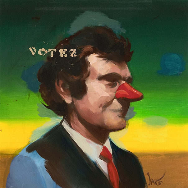 Portrait of Marcel Broodthaers wearing suit, plastic nose, and sash reading “VOTEZ”; surreal, pop-art political portrait; documentary oil on canvas.