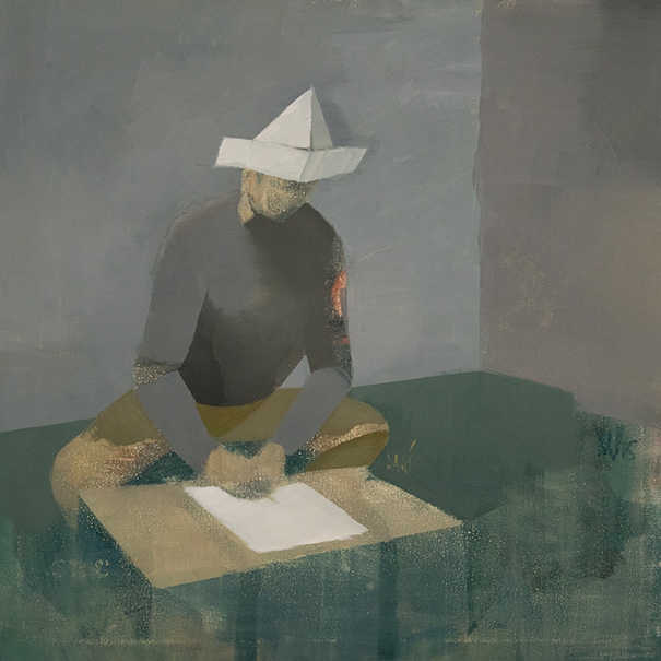 This painting of Marcel Broodthaers draws inspiration from a frame in his 1969 film «La Pluie (Projet pour un texte).» In this scene, Broodthaers is seen writing with a quill as rain gradually dissolves his words, reflecting on the fragility of language and the impermanence of meaning, while also contemplating the transformation of literature into painting—a meditation that blurs the boundaries between word and image.