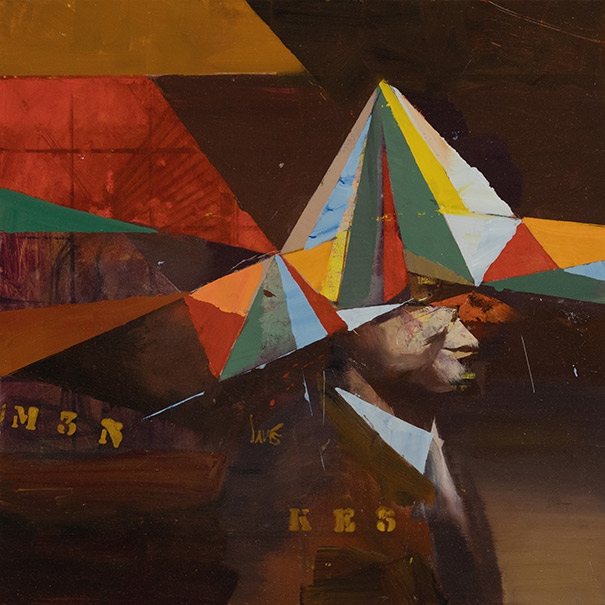 This painting explores cultural hybridity through three fundamental references. The first is an iconic black-and-white photograph of the Belgian artist Marcel Broodthaers, who, wearing a fake nose, stands in front of a truck from «La Continentale Menkès,» an art transportation company in Brussels, taken during the filming of his movie «Voyage à Waterloo» (1969). The second reference is «Galerie Légitime» (1962), an iconic work by Robert Filliou, which consisted of a portable art gallery contained in a folded paper hat. The third reference is the vibrant colors of the ceremonial costumes from the «Maracatú,» an Afro-Brazilian festivity celebrated in Pernambuco, Brazil.
