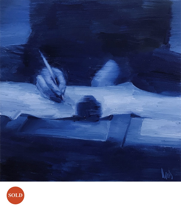 I chose oil on linen for its versatility and its rich historical repertoire of images and ideas. Only the finest materials were used: linen canvas, Old Holland oil paints, and Blockx medium. The square format echoes the cube of the Davis Museum, while the use of blue refers to the institution’s corporate color.