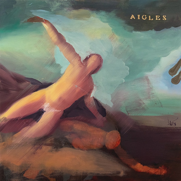 Formally, the work draws on classical compositional structures, though resolved in a contemporary pictorial language. It references Rubens’ “Prometheus Bound” (c. 1611–1618), where the titan suffers for gifting fire to humanity. Prometheus becomes a figure of creative defiance and sacrifice. Unlike Rubens, however, this version omits the eagle and instead presents the word “Aigles” hovering in a dark cloud—a gesture echoing Broodthaers’ practice of transforming text into visual form, shifting meaning from literary to plastic expression.