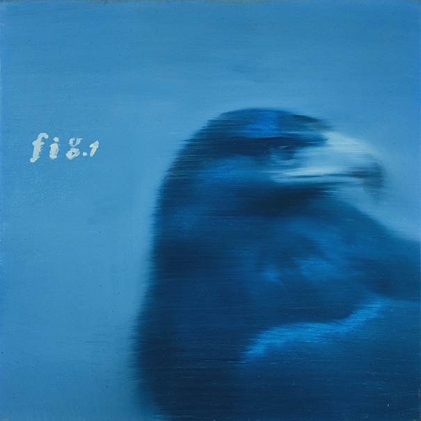 Portrait of eagle in blurred cobalt‑blue tones; engages with Broodthaers’s Musée d’Art Moderne, Département des Aigles; conceptual-documentary animal portrait; archival oil on canvas.