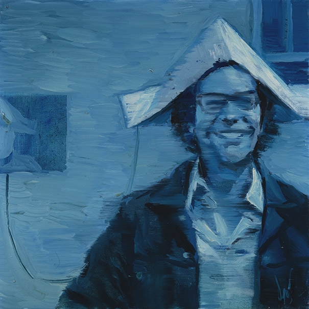 oil on linen; conceptual portrait; paper hat; blurred face; inspired by Filliou; archival painting; fictional museum; institutional critique; Galerie légitime; monochrome palette; smiling figure; contemporary icon