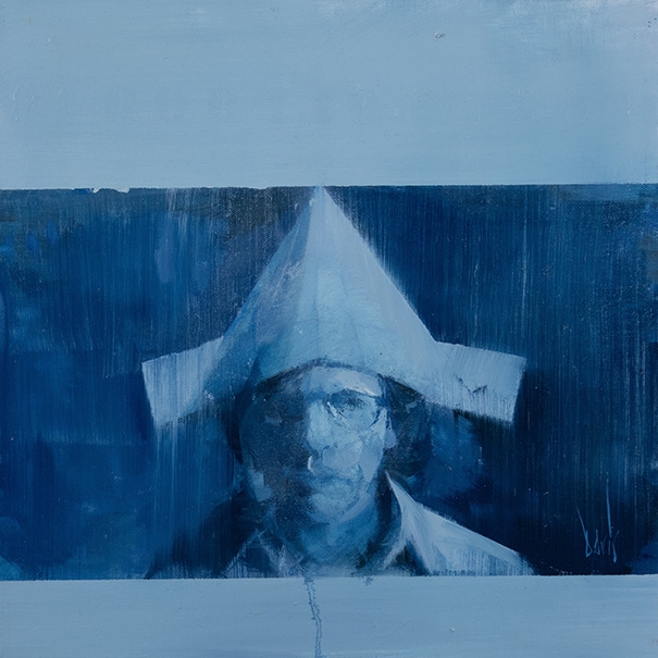 Conceived from a photograph centered on the assemblage Autoportrait bien fait, mal fait, pas fait (1973) by Robert Filliou—in which the artist appears wearing his Galerie Légitime, a folded paper hat conceived as a portable commercial gallery—the work occupies a critical space where portrait, citation, and conceptual device converge. Rather than simply referencing Filliou as a historical figure of Fluxus, the painting reactivates his interrogation of authorship, iconicity, and symbolic circulation through a deliberately unstable image. The portrait thus ceases to function as a fixed representation and instead becomes a displaced index, a rewritten archive, and an emblem of mobile museology.