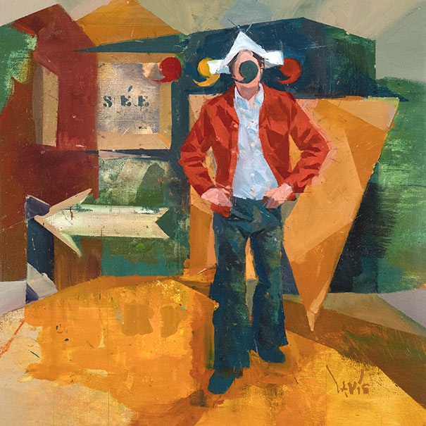 «Robert Filliou 18» (2018) by Davis Lisboa draws its inspiration from an anonymous and undated photograph of Robert Filliou, captured wearing glasses and smoking a cigarette. This enigmatic image evokes Filliou’s radical and playful spirit, especially as embodied in his project «La Galerie Légitime» (1962–1963), a portable art gallery that challenged traditional structures of art circulation and legitimacy. The painting engages in a broader critical narrative within art history, tracing a lineage that extends from Marcel Duchamp’s «Boîte-en-valise» (1936–1941) through Filliou’s own interventions, to Marcel Broodthaers’ «Musée d’Art Moderne, Département des Aigles» (1968–1972), figures who blurred the boundaries of authorship and exhibition.