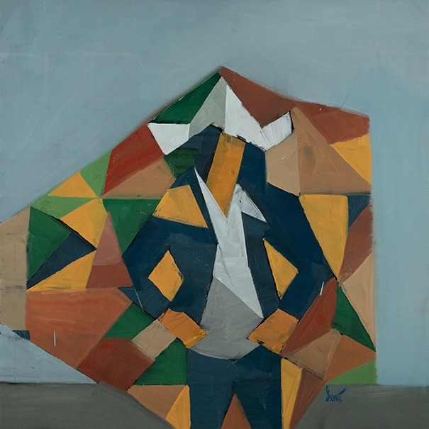 Formally, the painting draws inspiration from the Cubist language of Pablo Picasso, where tensions between figuration and abstraction are interwoven.